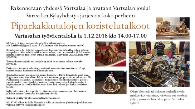Piparkakkutalkoot 1.12.2018, varaa paikkasi!! Jaa: Click to share on X(Avautuu uudessa ikkunassa) X Jaa Facebookissa(Avautuu uudessa ikkunassa) Facebook Tykkää Lataa...