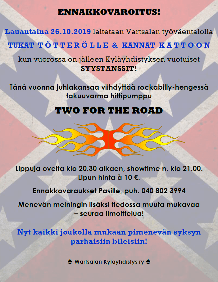 Nyt kannattaa kaivaa tanssitennarit naftaliinista ja tehdä henkilökohtainen kalenterivaraus lauantaille 26.10., jolloin pannaan taas jalalla koreasti Kyläyhdistyksen vuotuisten syystanssien merkeissä!